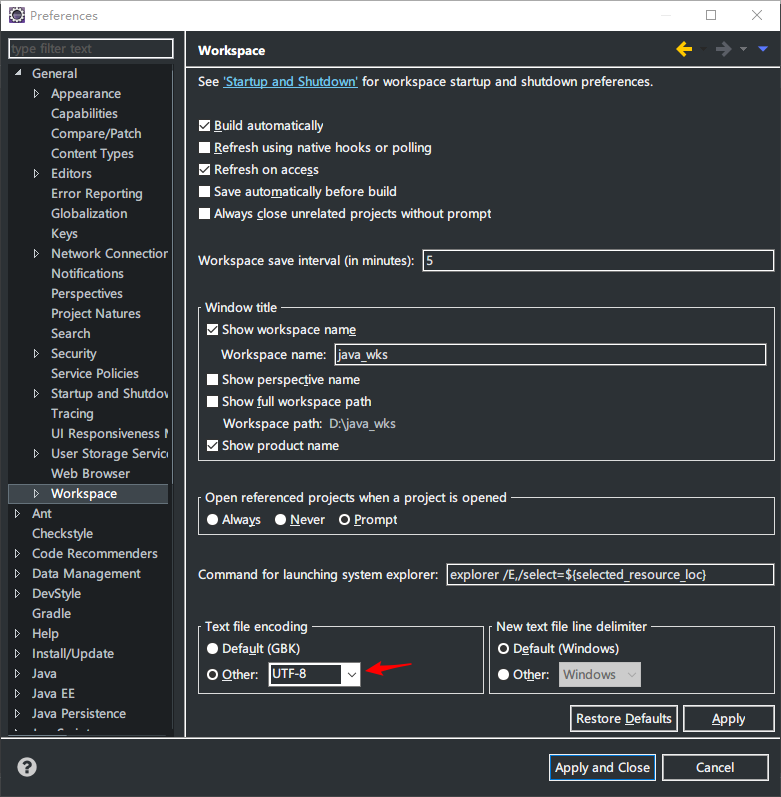 General/Workspace/Text file encoding/Other选中UTF-8修改![]()